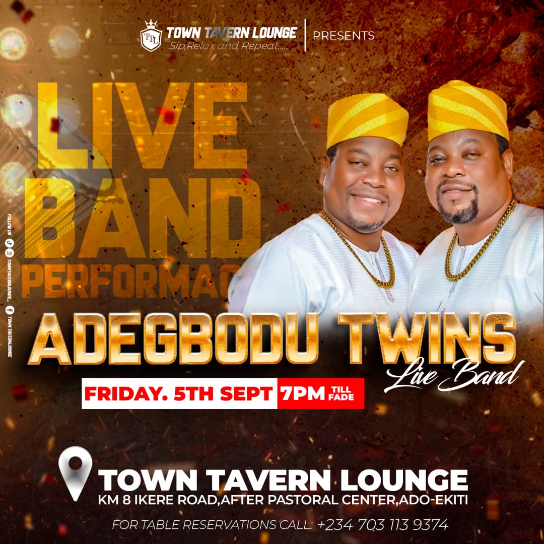 Ado-Ekiti is set for another night of premium entertainment as the management of Town Tavern Lounge has announced a live pre-opening band performance by the popular gospel fuji sensation, the Adegbodu Twins, coming up on Friday, September 5, 2025.