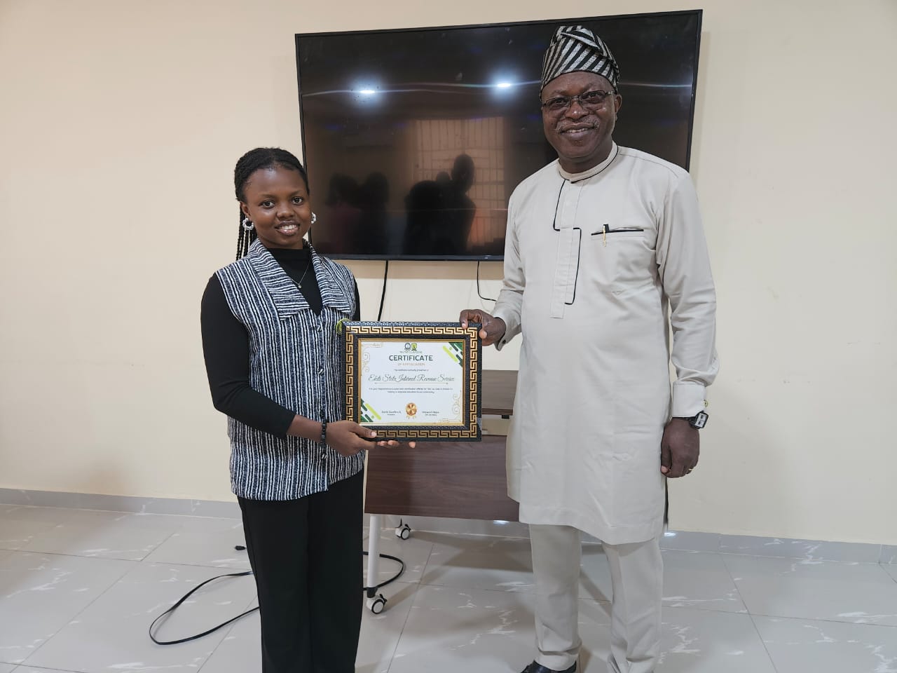 The visit culminated in the Executive Chairman receiving a Certificate of Appreciation from the Tax Club, FUOYE, on behalf of EKIRS for its magnanimous support and contribution offered for “the Tax Goes to School 1.0”.