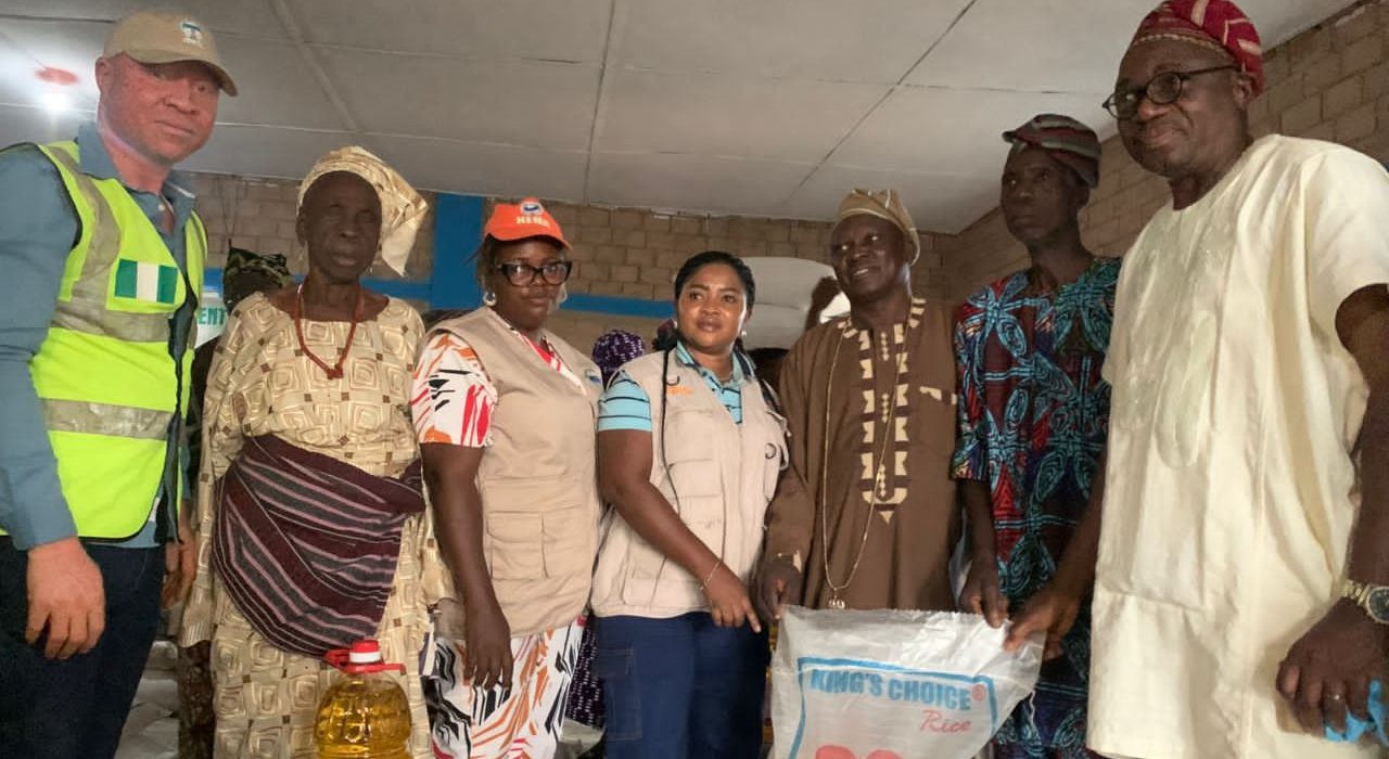 Items distributed include: Foodstuffs such as Rice, Garri, vegetable oil, seasoning cube, spaghetti, iodine salt, tomato paste among others.