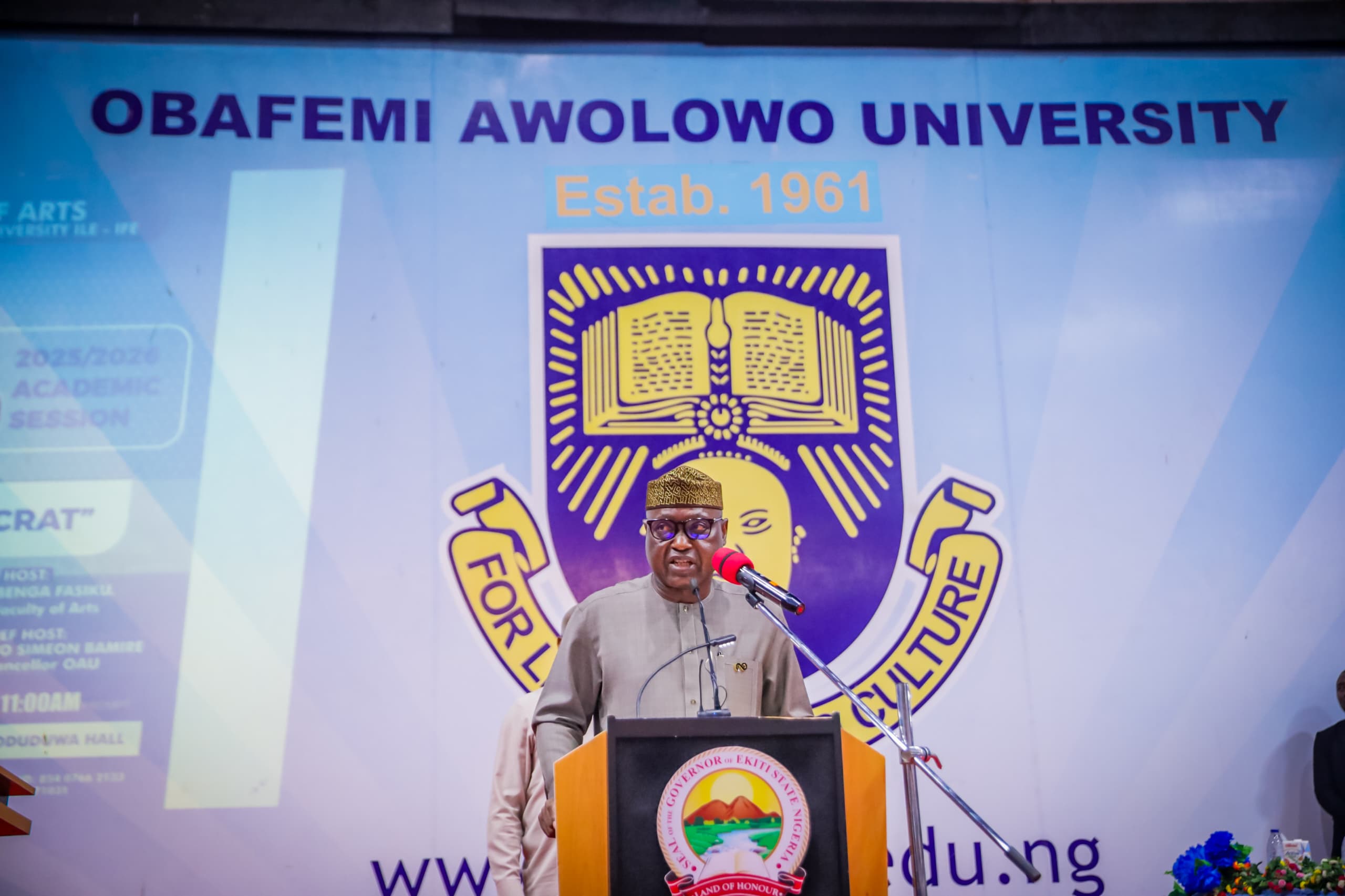 In attendance at the lecture, which took place at the Oduduwa Hall of the OAU were the Osun State Governor, who was represented by the Commissioner for Education, Mr Dipo Eluwole; Asiwaju Bola Oyebamiji, Govermorship candidate of the APC Osun State; Secretary to Ekiti State Government, Prof Habibat Adubiaro; Chief of Staff, Mr Niyi Adebayo; Commisisoner for Education, Dr Olabimpe Aderiye; Special Adviser Tertiary Education, Prof Akeem Azeez; Special Adviser Office of Transformation and Service Delivery, Dr John Ekundayo; Special Adviser on Media and Startegy, Mr Yinka Oyebode and Director General office of Community Communications, Mrs Mary Oso- Omotoso and representatives of youth and students organisations from Ekiti State.